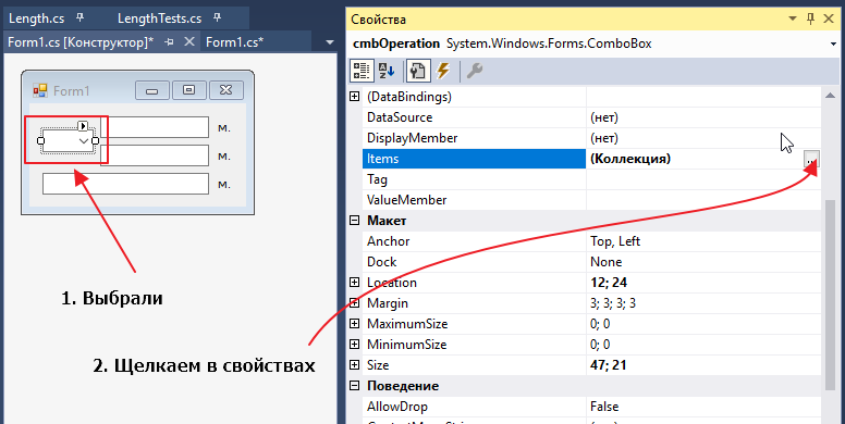 Давайте теперь добавим возможность выбрать операции, а то у нас все плюс да плюс. Перейдем на редактор форму, выберем cmbOperation, найдем свойство Items и кликнем на него