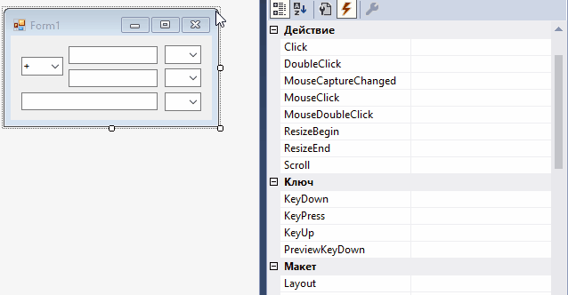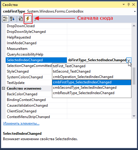 хм, чего-то не реагирует… а ну да! Мы ведь забыли добавить обработчик в переключения операции, короче идем на форму кликаем дважды на cmbOperation и добавляем код: