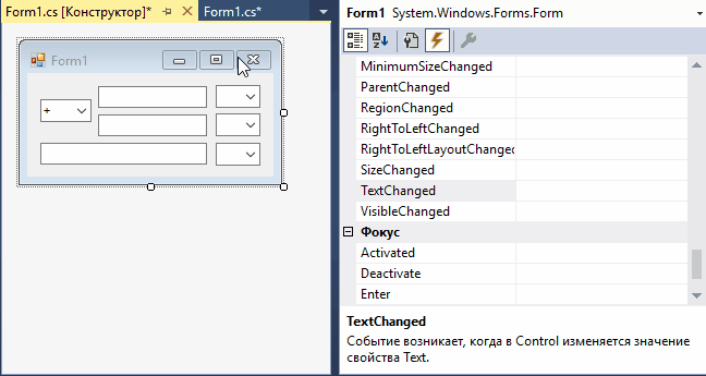 теперь тоже самое делаем с полями для ввода (у нас их два, третье – это результат, мы ему ничего не привязываем), только там правим обработчик TextChanged: