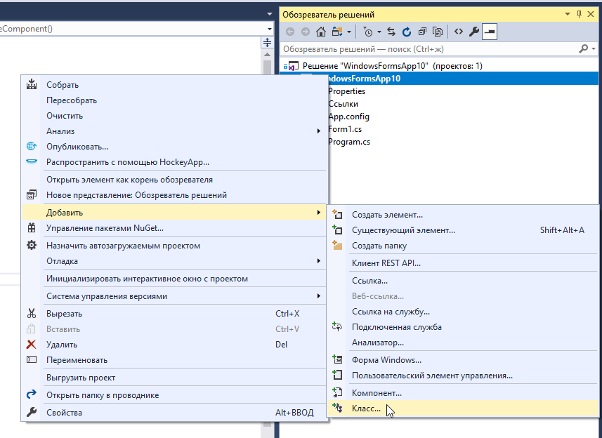 И так, тыкаем правой кнопкой мыши на называние проекта и выбираем Класс…