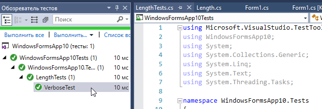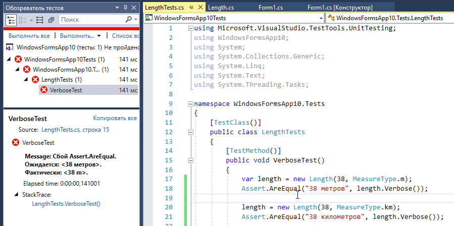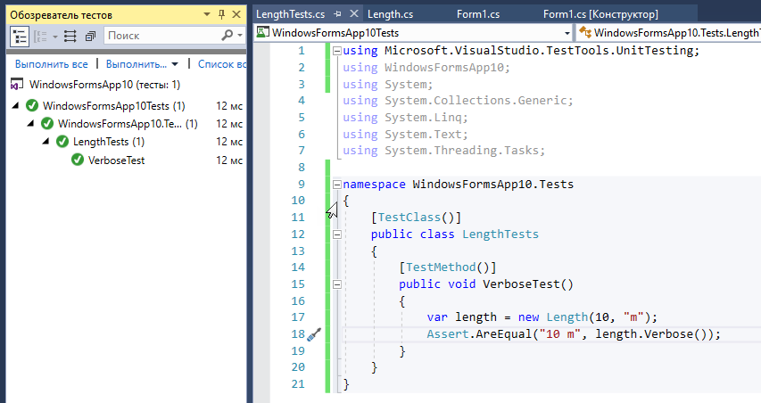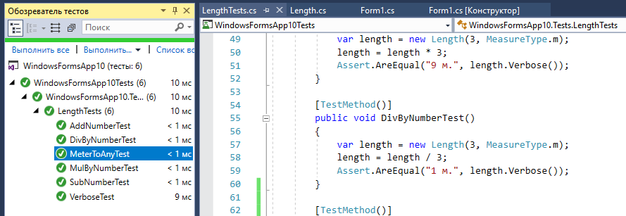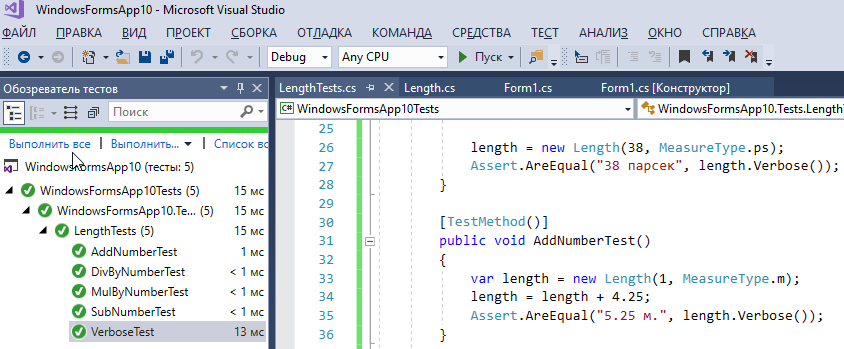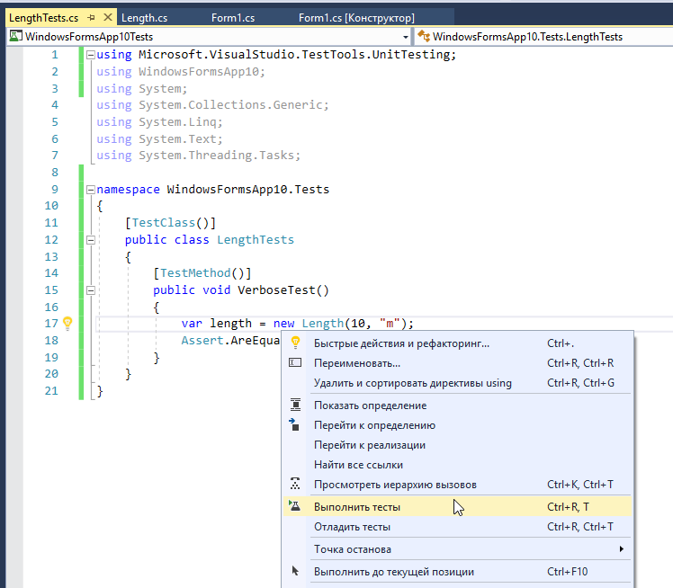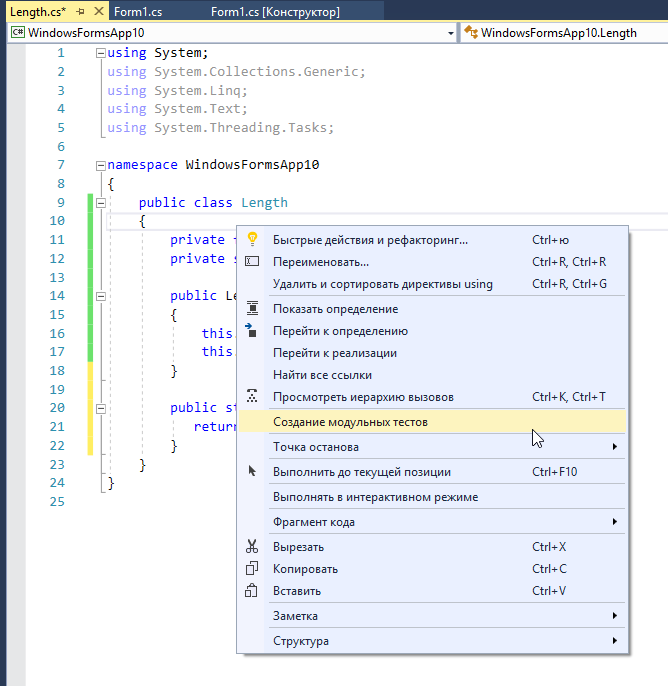 И так, тыкаем где-нибудь в центре класса Length правой кнопкой мыши и выбираем Создание модульных тестов