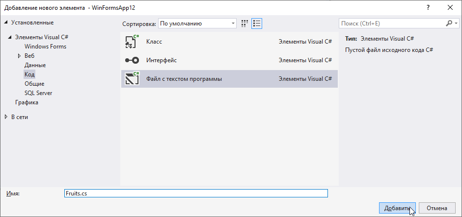 Теперь под каждый фрукт создадим класс. Чтобы не захламлять сильно файлы кодом, создадим отдельный файлик под классы с фруктами и назовем его Fruits.cs