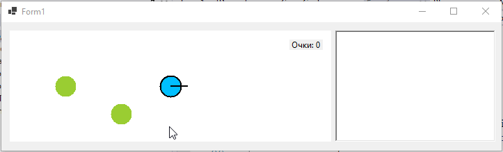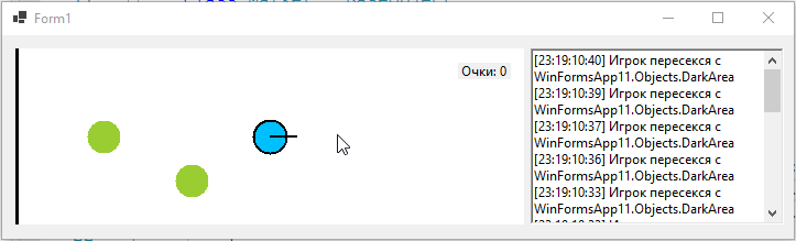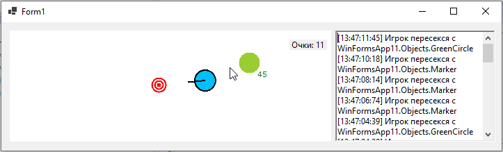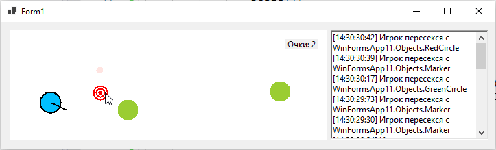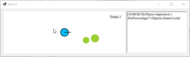 Реализовать вывод очков. Увеличивать количество очков при пересечении с объектом добавленным в предыдущем пункте. Дополнительно добавить на поле несколько зеленых кругов.